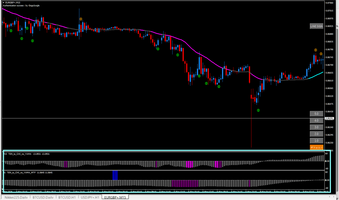 たとえば谷の自動エントリ―の場合、ラインから浮いたところからエントリ―されることもありますが、1時間足ならある程度浮いてもTP決済されやすいイメージがあります。(個人的な感覚ですが)