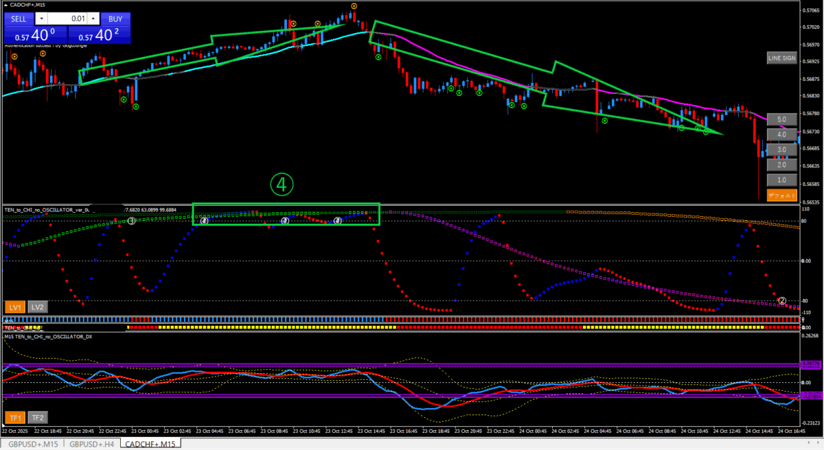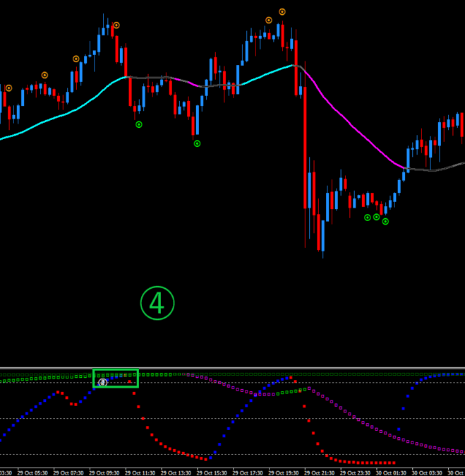 画像なら④と④の間にあるグリーンの点でエントリーしたとして、利が乗ればかなり利幅を獲れます。