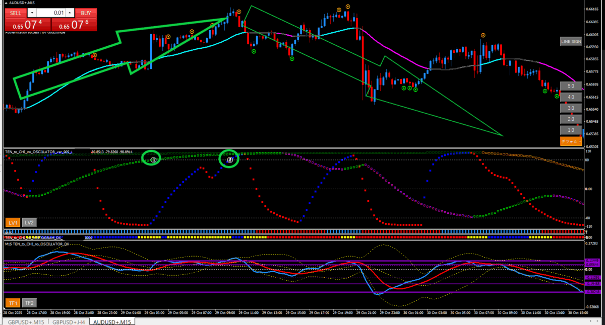 画像ではどちらも+80にいて、カレントと上位足で買いが溜まっている状態ですね。