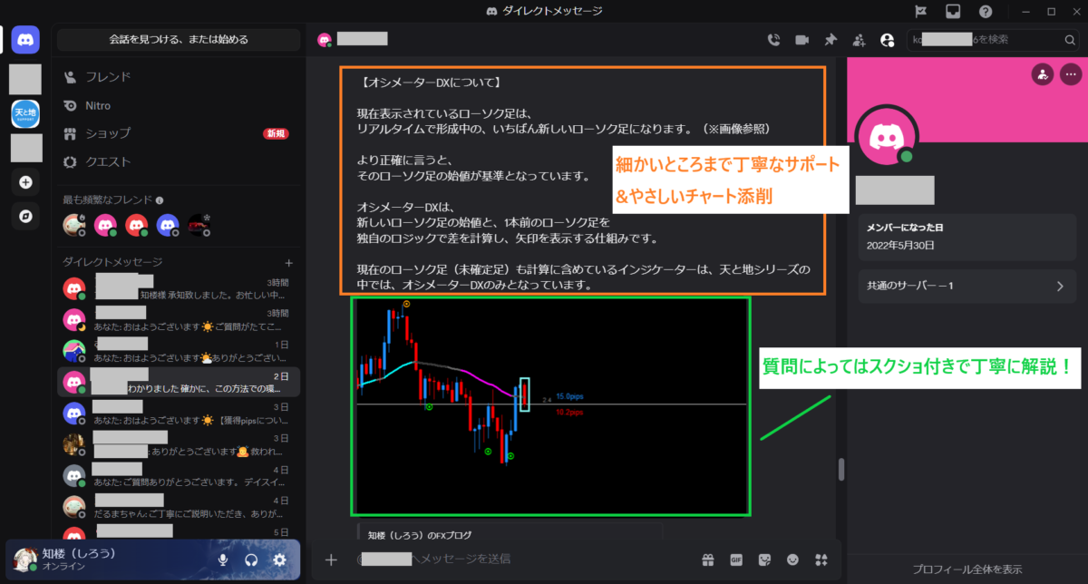 知楼さんのサポートのおかげで、天と地のインジケーターの見方や使い方にはだいぶ慣れてきました。使い方がわかるとトレードも楽しいです