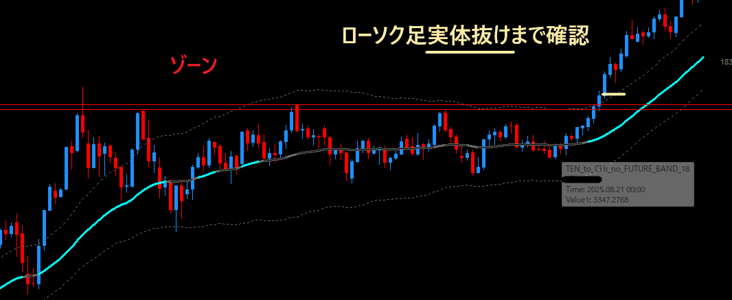 レジサポのラインですが実体~ヒゲまでをゾーンとしてこのゾーンに近い場合は方向感がわからない状況です。