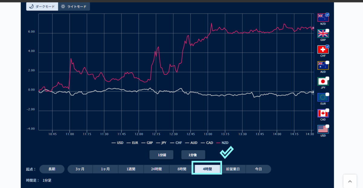 今表示しているのはNZDとCHF、どちらも強い状態ですね。(いまはNZDが政策金利で上がっているだけですが)