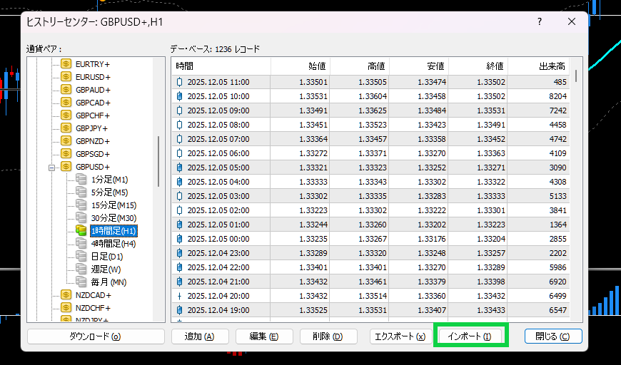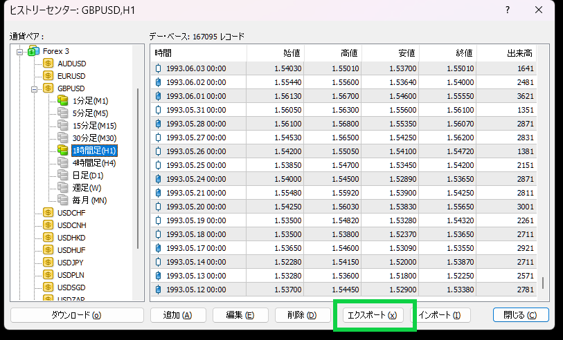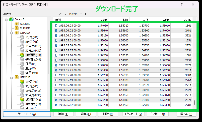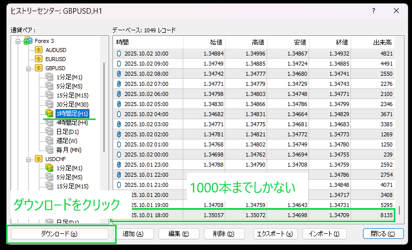 ただしローソク足に関してはFX業者によっては1000本で限られていることが多いため、別途ダウンロードする必要があります。