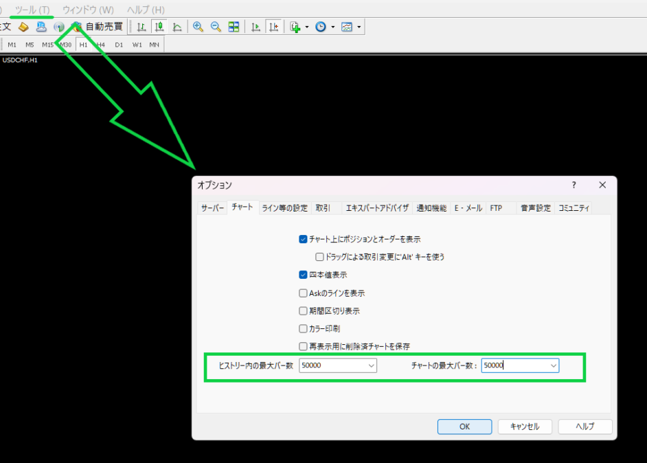 まず、MT4のオプション → ツール でチャートタブでできるだけ多くの数字をいれます。