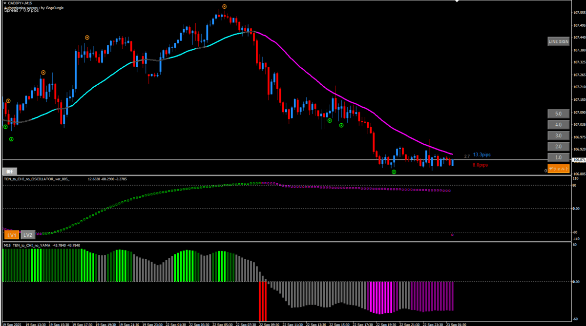 ロットを半分に落としてエントリー(=口座1%運用)しましたが、オシレーターDXによって少しの損切りという結果になりました。
