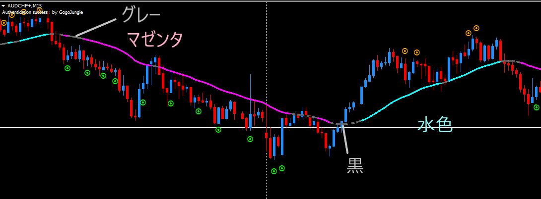 つまりトレンドが大きいと水色やマゼンタが出やすく、レンジならグレーや黒が出やすいといった具合です。